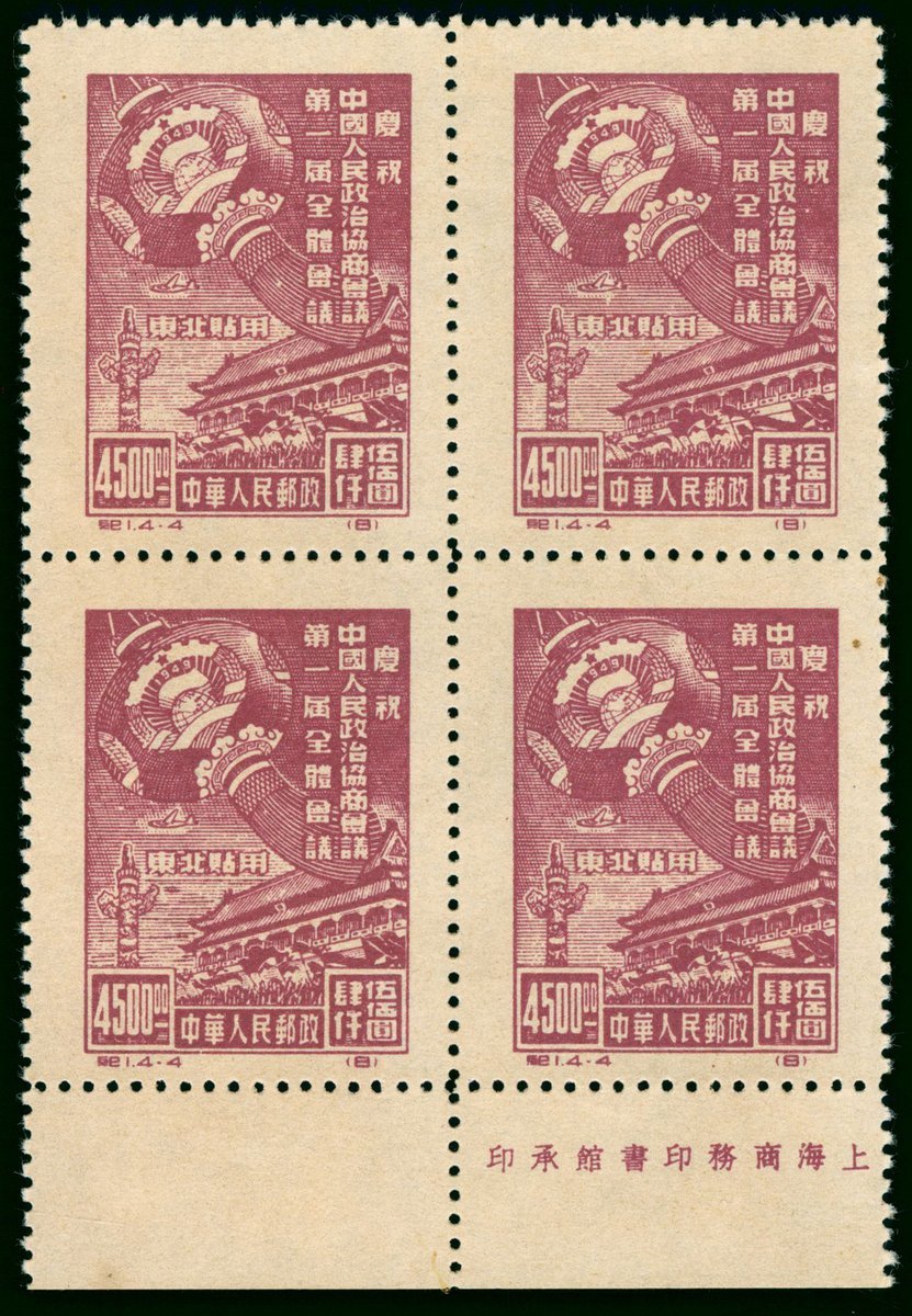 1949年紀東1第一屆政治協商會議原版新票四方連1套,均帶下邊同位置廠銘邊紙,紙質微黃,票面顏色鮮豔,齒孔完整,上中品,少見