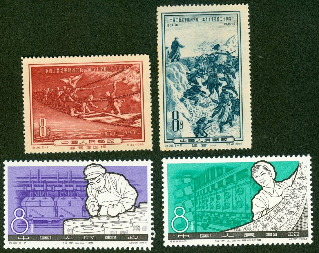 1955 (30 Dec.) C36 20th Anniv. of Victorious Completion of 25,000 Li Long March by Chinese Red Army, 8f in complete set of two (2), unused; 1964 (30 Dec.) S64 Chemical Industry 8f. in complete set of eight. unmounted mint. Yang C133-134; S392-399.