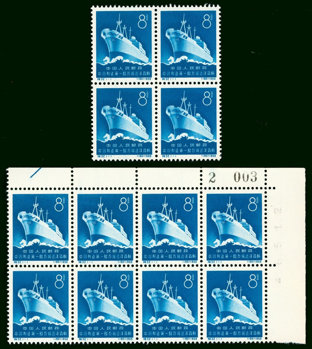 1960 (15 Dec.) S32 China's First 10,000 ton Oceangoing Freighter, 8f. in block of four, block of eight with corner margin, sheet number and control number, unused. Yang S160