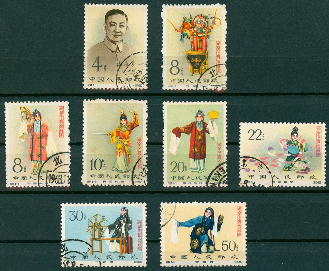 1962年紀94 梅蘭芳舞台藝術全套八枚, 舊票, 有黄斑及紙有老化