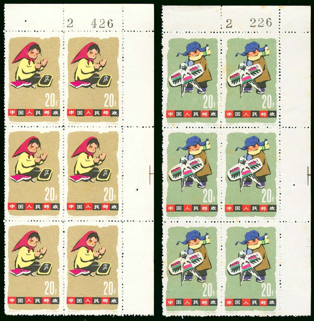 1963年特54兒童有齒新票六方連1套,帶右上直角邊紙,邊紙帶全張流水號,票面顏色鮮豔,齒孔完整,上中品