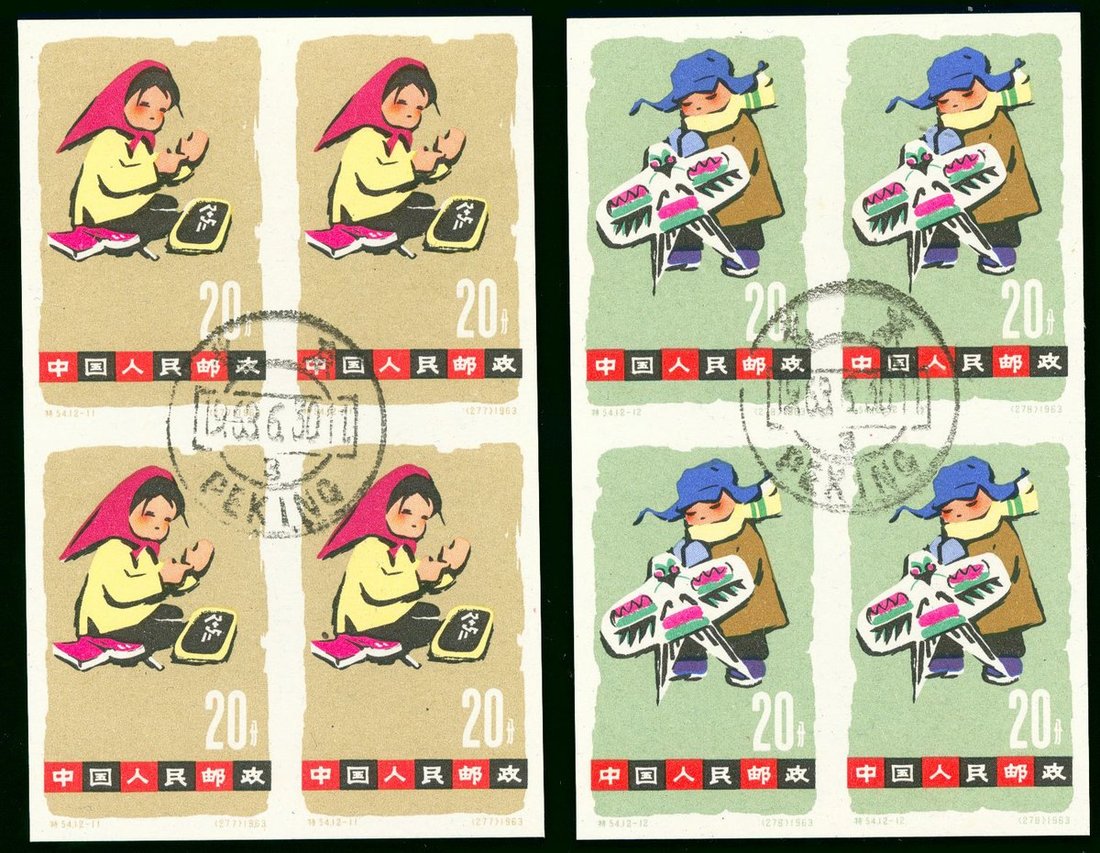 1963年特54兒童無齒蓋銷四方連1套,票面顏色鮮豔,邊框四白邊裁切整齊,加蓋郵戳清晰,上中品