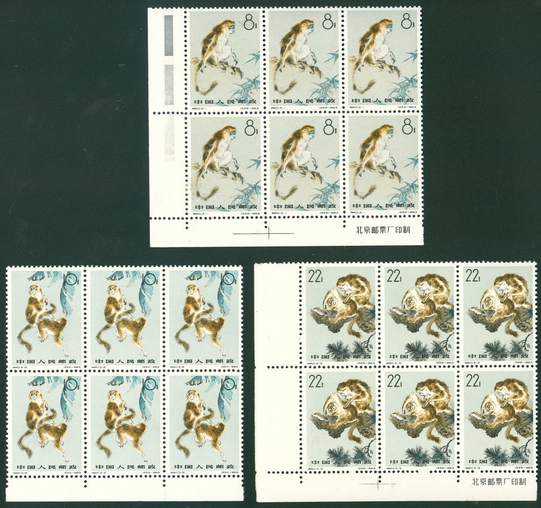 1963年特60金絲猴新票六方連1套,其中8分及22分帶左下廠銘直角邊紙,10分帶下邊紙,票面顏色鮮豔,齒孔完整,原膠微黃,整體上中品