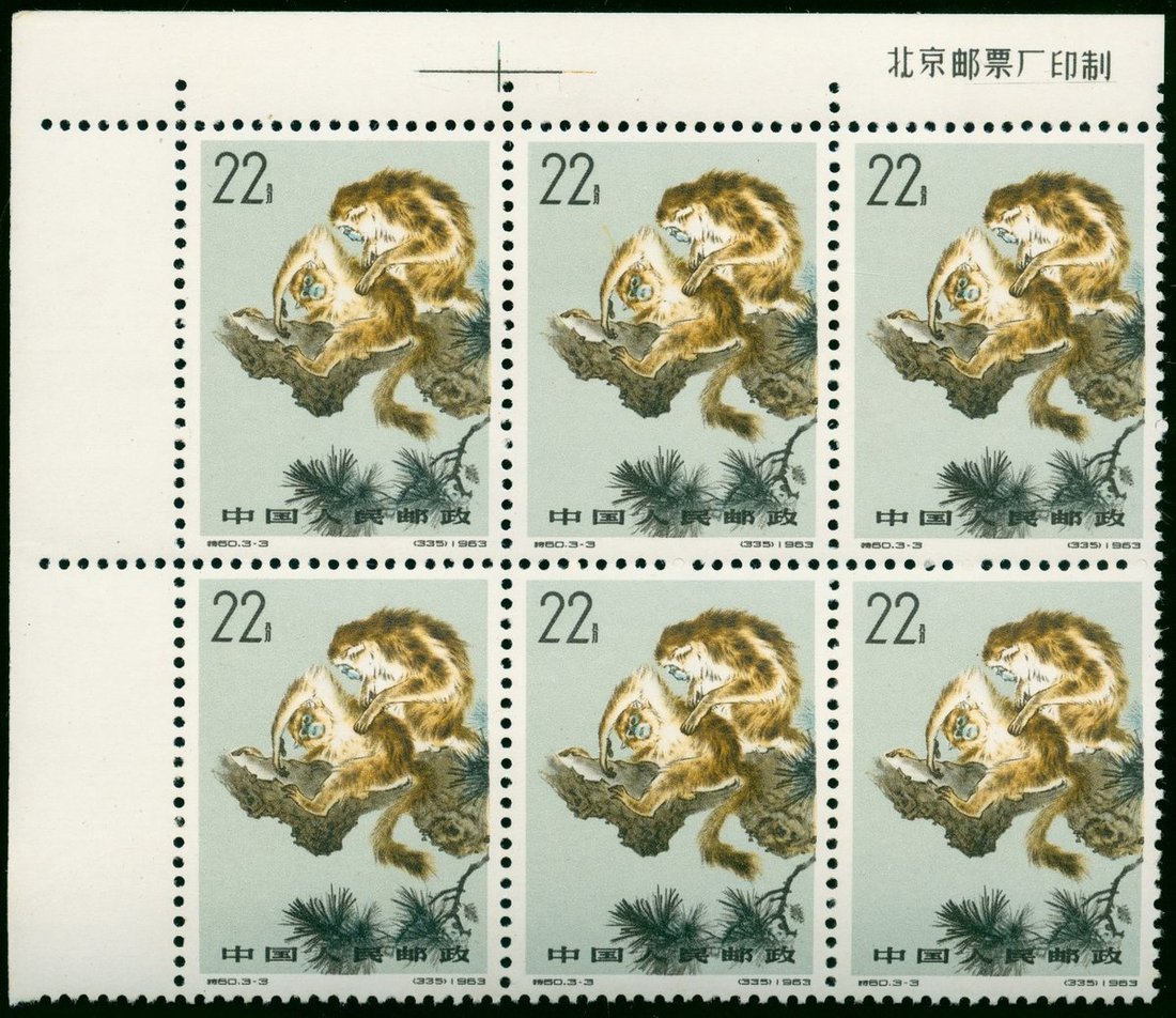 1963年特60金絲猴有齒新票六方連1套,均帶左上直角廠銘邊紙,票面顏色鮮豔,齒孔完整,原膠,背膠潤澤,上中品