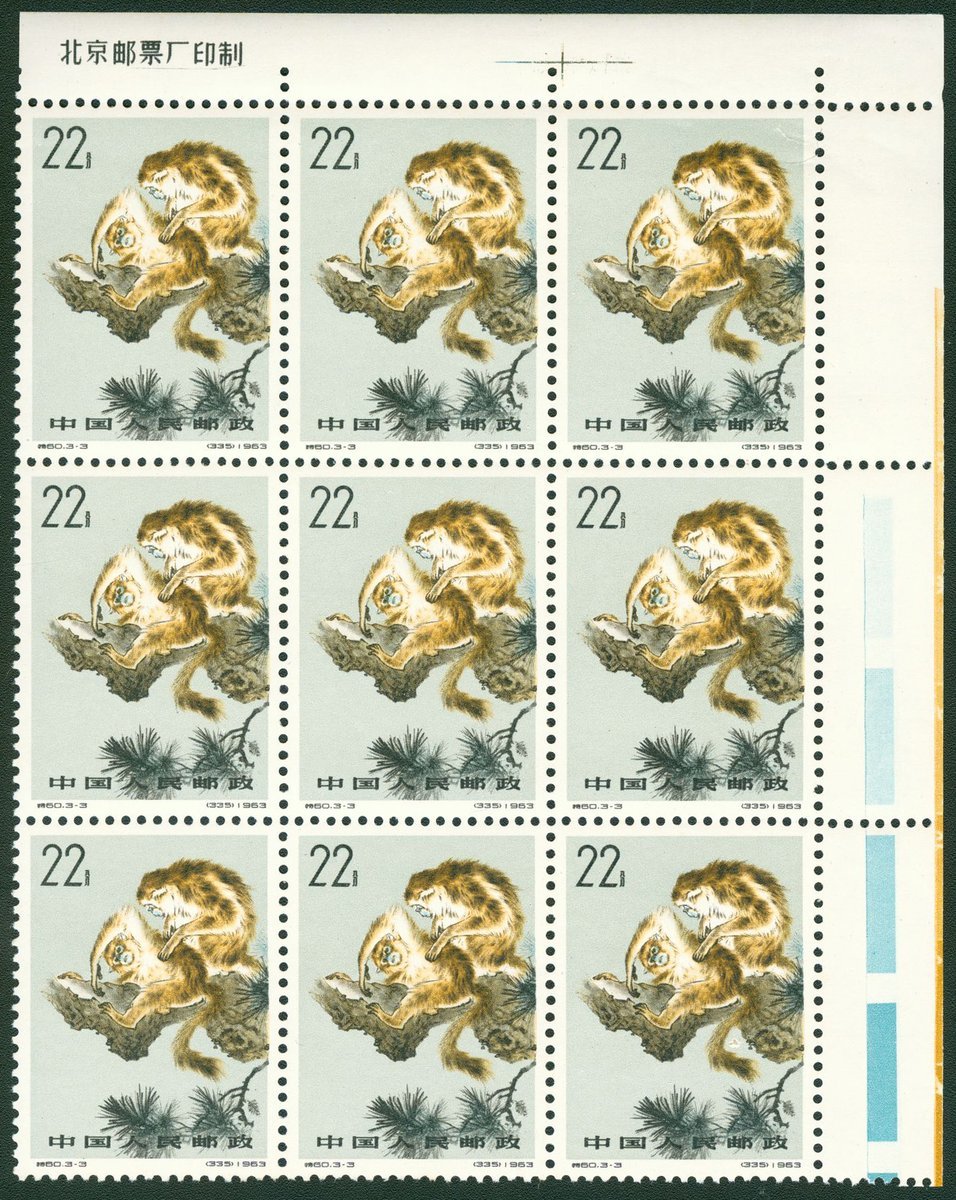 1963年特60金絲猴有齒新票九方連1套,均帶左上直角廠銘邊紙,票面顏色鮮豔,齒孔完整,原膠,背膠潤澤,上中品