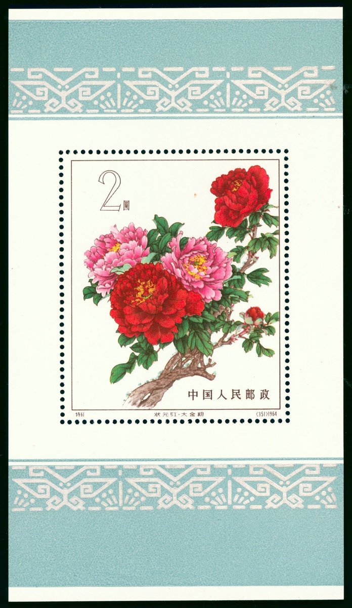 1964年特61M牡丹小型張新票1枚,票面顏色鮮豔,銀粉閃亮,四角尖,背面紙質潔淨,上中品