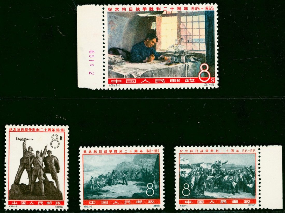 1965 (3 Sep.) C115 20th Anniv. of Victory of Anti-Japanese War. 8f. in complete set of four, 4f. Chairman Mao with left margin and control number, another 8f. with right margin, unused. Yang C366-369.