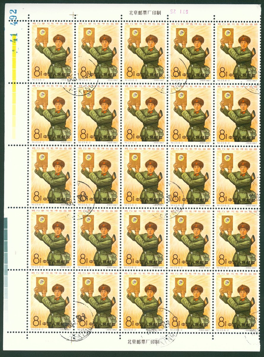 1967 (25 Mar.) C123 Liu Ying Chung 8f. holding book of Chairman Mao texts, left half sheet of 25 with Peking cancelled to order, very fine.