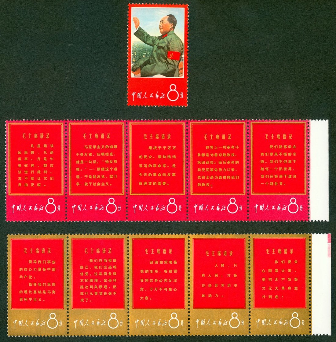 1967 (20 Apr.) W1 "Long Live Invincible Chairman Mao's Thoughts" set of 11, including Chairman Mao 8f. and two se-tenant strips of five (of which one folded), very fine unmounted mint with bright gold. Yang W1-W11.