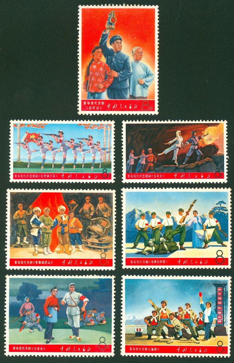 1968 (30 Jan.) W5 Revolutionary Literature and Art, 8f. Shajiabang, On the Docks, Raid on White Tiger, Taking Tiger Mountain, Red Lantern, White-haired Girl, Red Detachment of Women, unmounted mint and toned gum. Yang W29-35