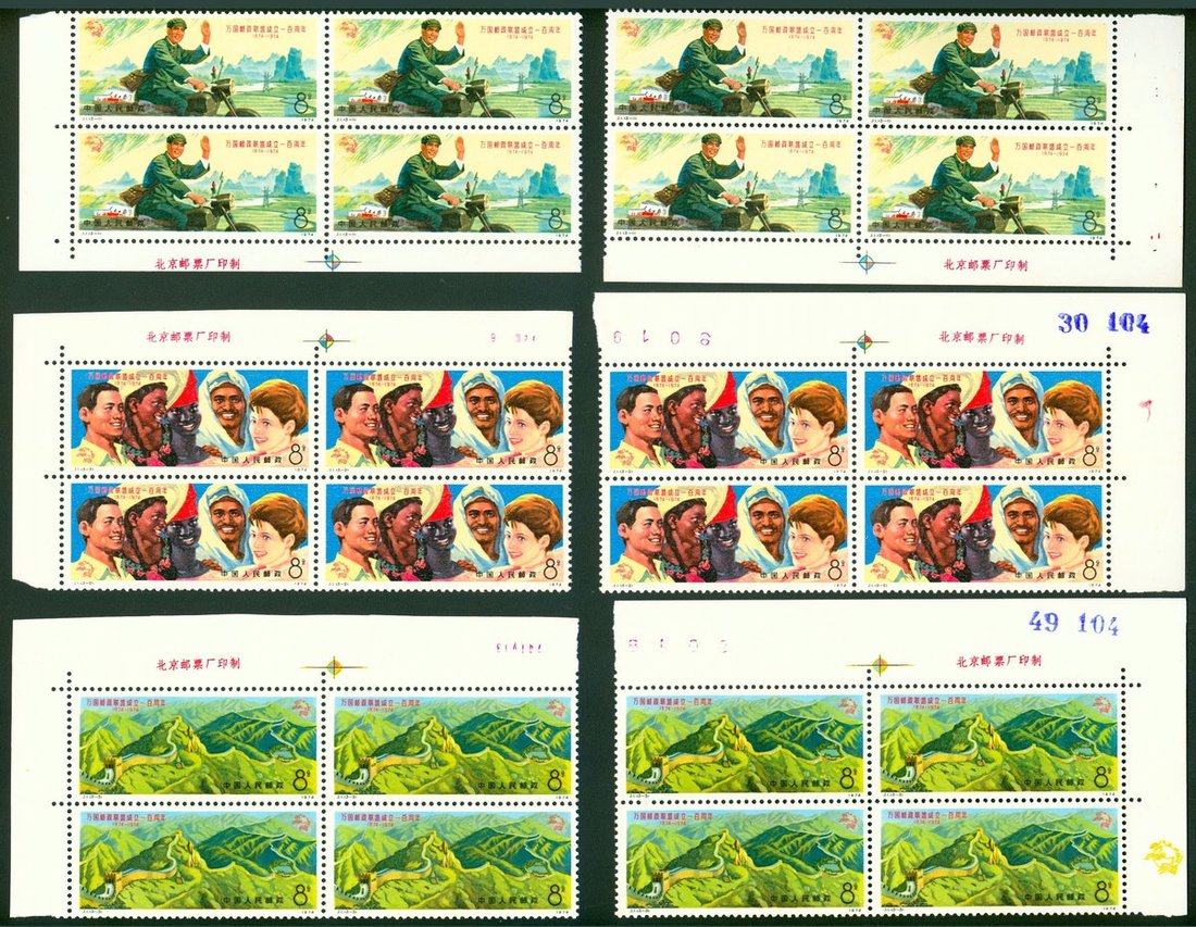 1974年J1萬國郵政聯盟新票8套,為四方連2個,其中3-1帶左下直角廠銘邊紙及右下直角廠銘邊紙,3-2及3-3左上及左下直角廠銘邊紙,帶票面顏色鮮豔,齒孔完整,原膠,上中品