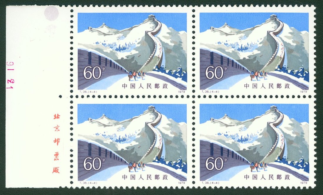 1979年T38長城新票12套,分為套票四方連3套,均帶右邊紙,大部分有廠銘或色標,整體顏色鮮豔,齒孔完整,原膠,上品