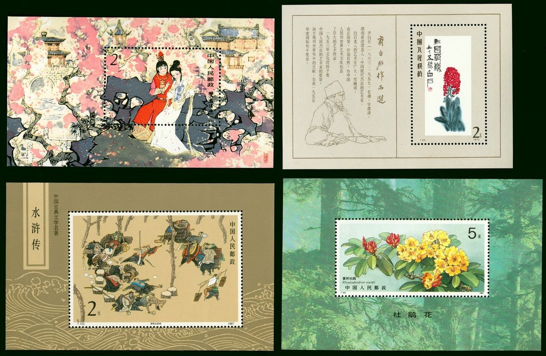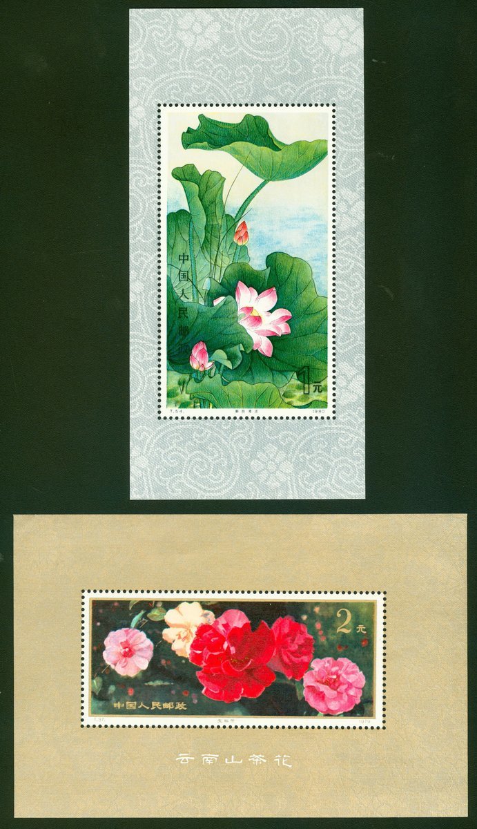 1979-91年JT小型張新票6枚,包括T37M山茶花,T44M齊白石,T54M荷花,T69M紅樓夢等,整體票面顏色鮮豔,四角尖,原膠,上品