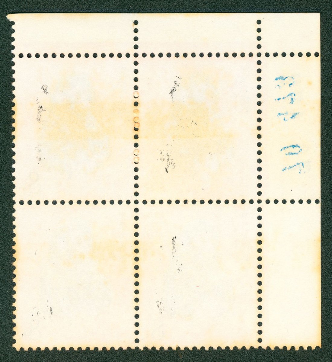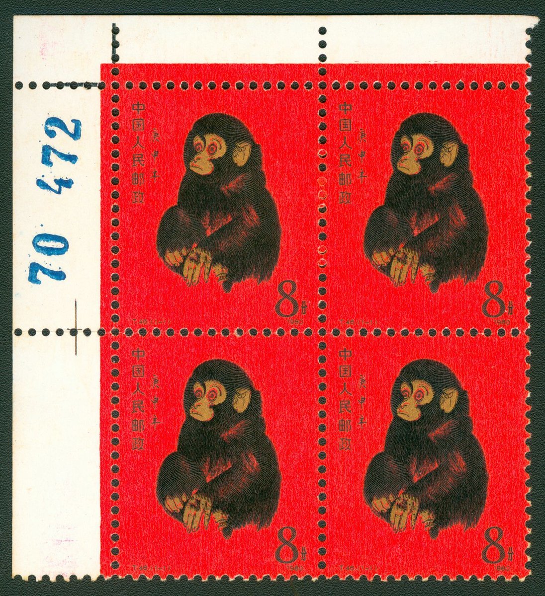1980年T46庚申年新票四方連1件,帶左上直角邊紙,邊紙有流水號,票面顏色鮮豔,齒孔完整,中間橫向齒折,原膠,背膠局部微黃,上中品