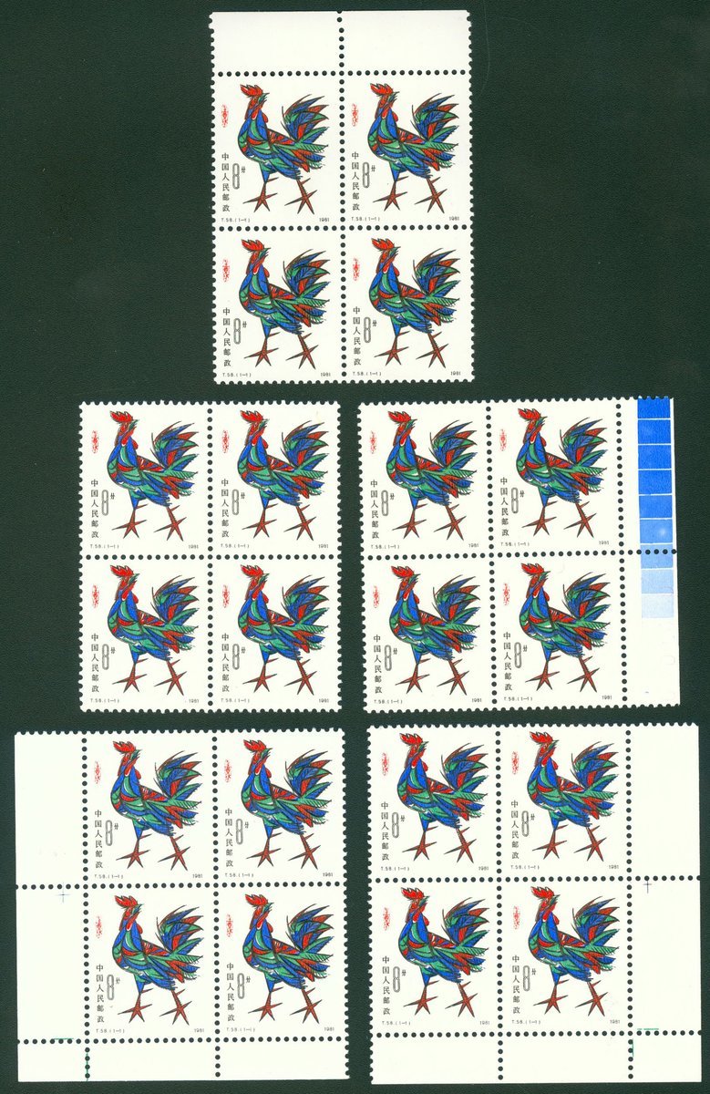 1981年T58辛酉年新票四方連5件,部分帶直角邊紙或色標邊紙等,票面顏色鮮豔,齒孔完整,原膠微黃,整體上中品