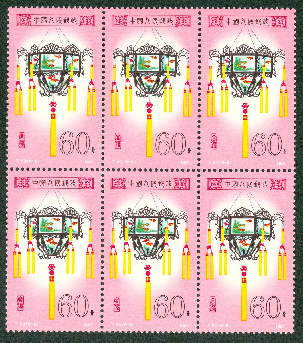 1981年T60宮燈新票六方連1套,票面顏色鮮豔,齒孔完整,原膠,上品