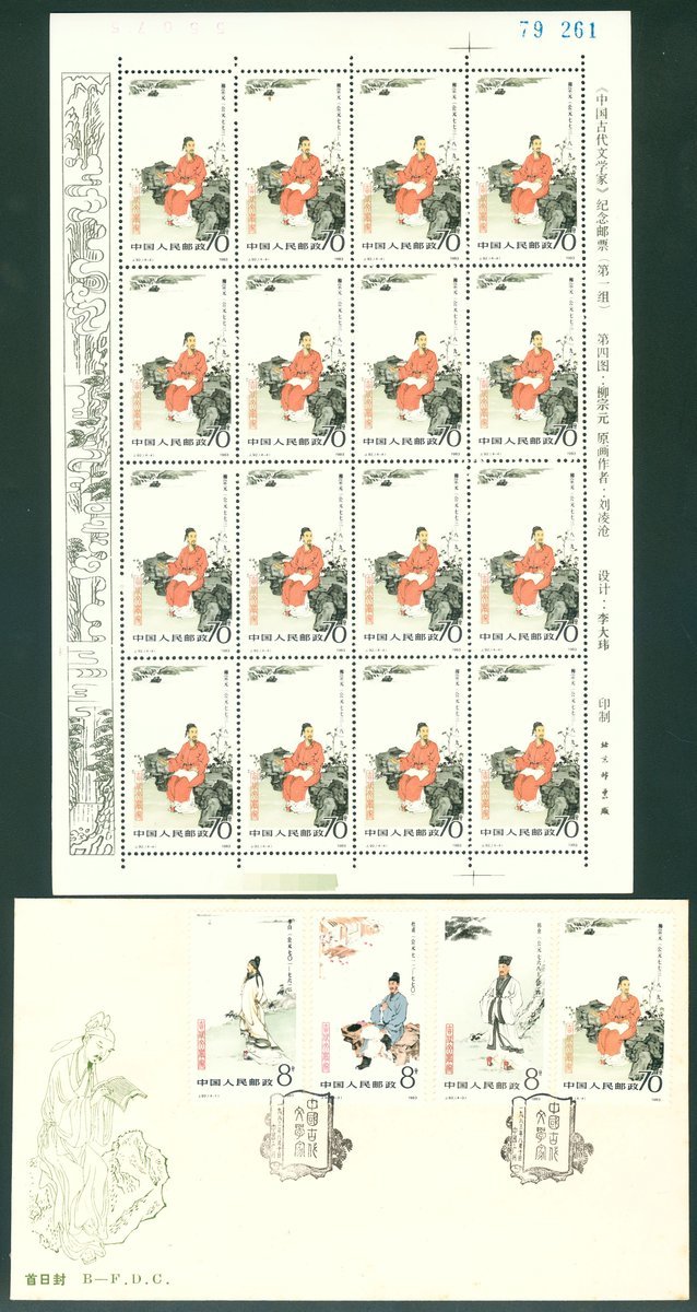 1983年J92古代文學家新票16枚小版張1套,票面顏色鮮豔,原膠,部分郵票背膠微黃,另有此票北京分公司發行首日封1件,整體上中品