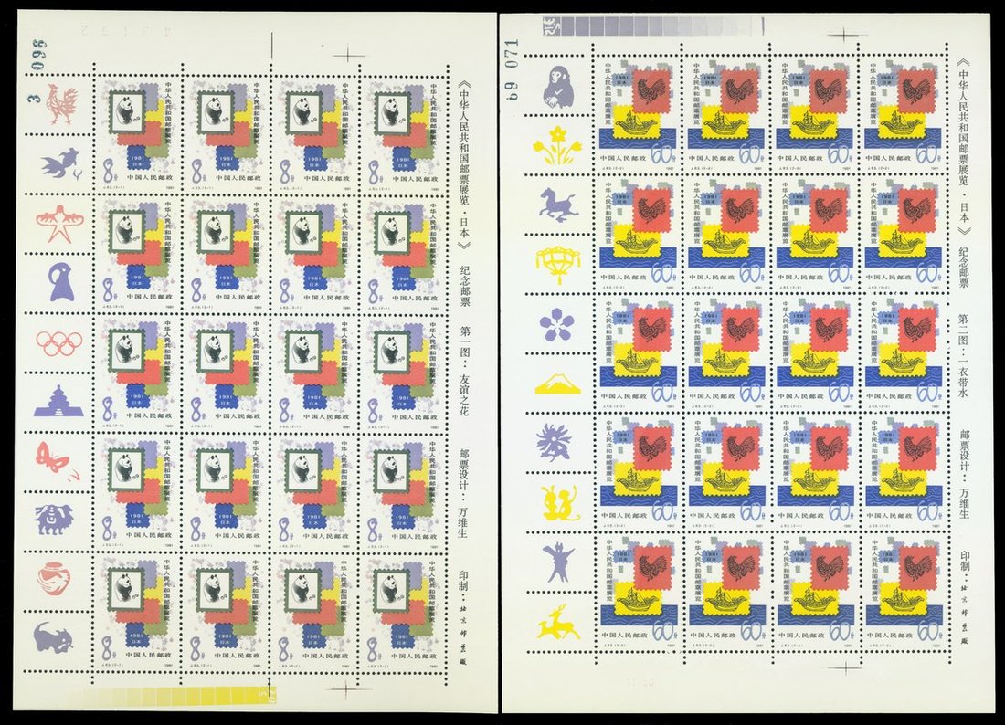 1981年J63中日新票20枚小版張3套,顏色鮮豔,邊紙完整,原膠,上中品