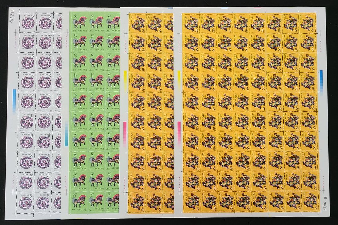 1988-90年生肖新票全張一組,包括龍年2版,蛇年及馬年各一版,票面顏色鮮豔,邊紙完整,原膠微黃,上中品