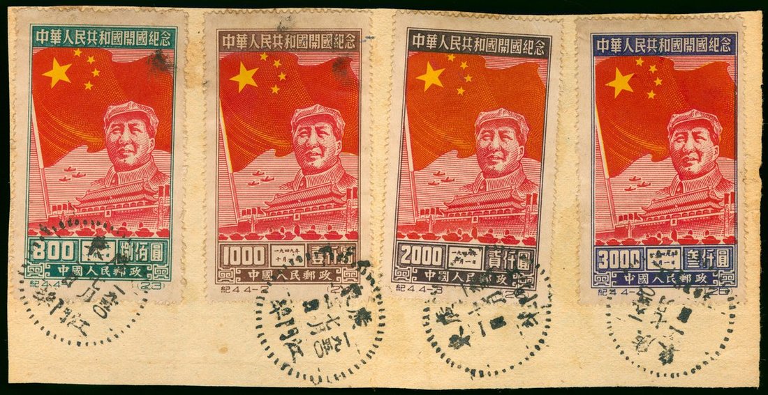 1950 (1 Jul.) part of cover bearing set of C4 Inauguration of Chinese People's Republic on 1st October 1949 tied by Kongmoonfow c.d.s. (Founding day of the Chinese Communist Party), very fine.