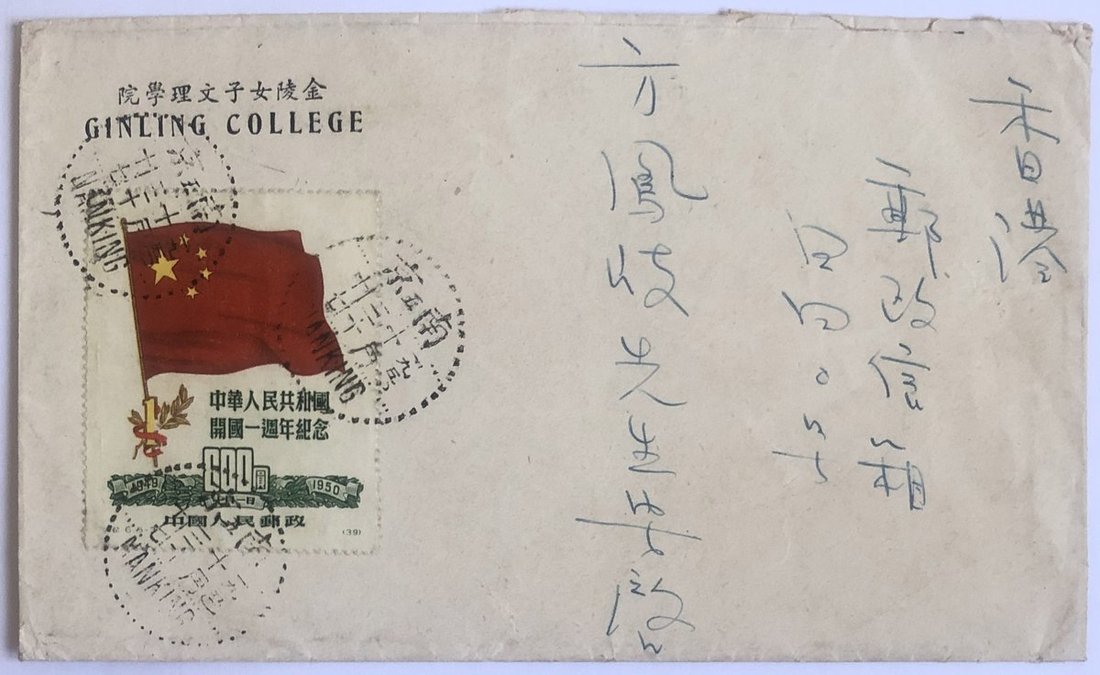 1950年南京金陵女子理學院寄香港公函封1件,貼紀6開國一周年800元1枚,銷南京11月30日戳,郵戳清晰,保存完好