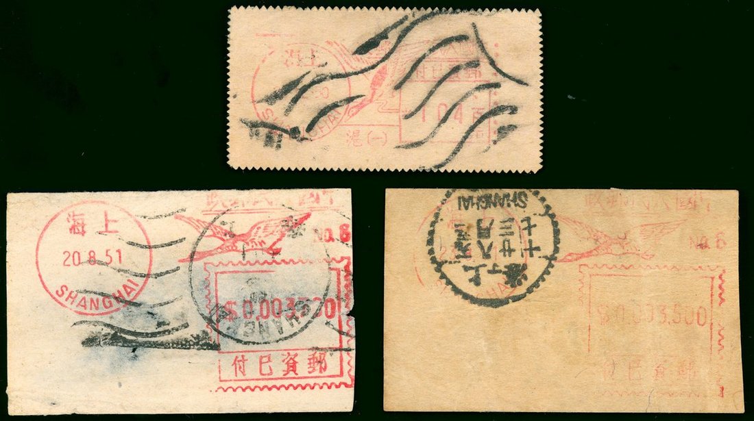 1950年12月20日-51年8月23日上海機印紅色郵資已付郵戳剪片两枚及郵資已付標籤一枚.