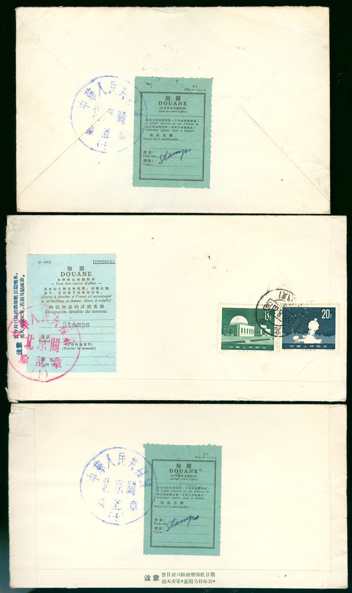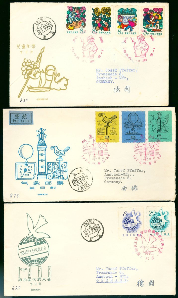 1958年北京寄德國中國郵票總公司首日封3件,分別貼紀49,特18,特24全套郵票,銷各票首日紀念戳,另銷北京同日日戳,其中特24封背補貼郵票航空實寄,均貼有北京海關驗關條,並騎縫蓋北京海關驗訖章,保存完好