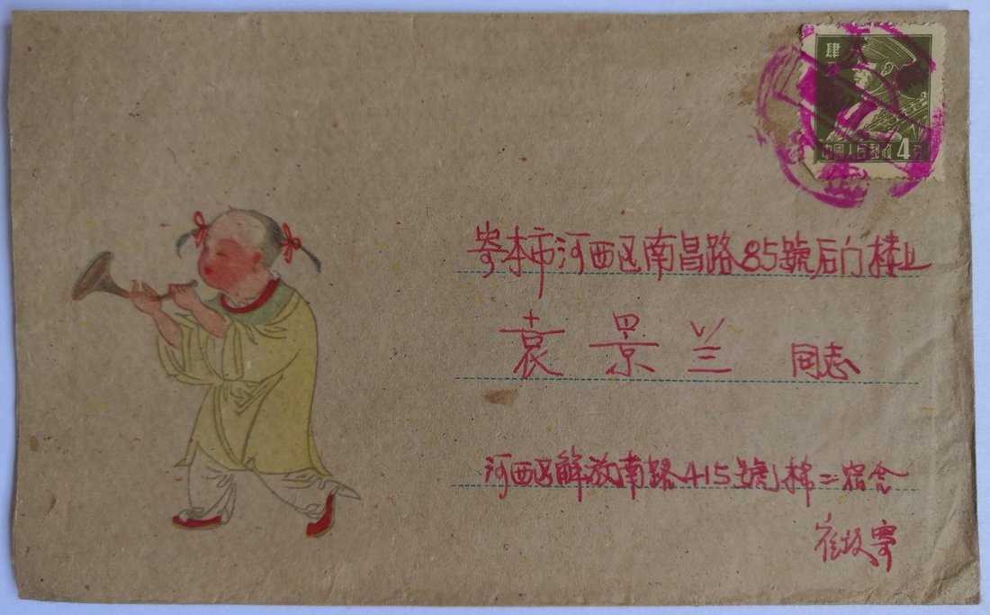 1960年天津本埠实寄封1件,贴普8.4分1枚,销少见天津5民7月4日紫色胶质日戳,为六十年代初民办邮局专用日戳,有落地戳,收信人为著名音乐家袁景兰先生,邮戳清晰,保存完好,民办邮局兴起于大跃进时期,全国各地均有出现,因其存在时间极短,留存实寄封非常少见