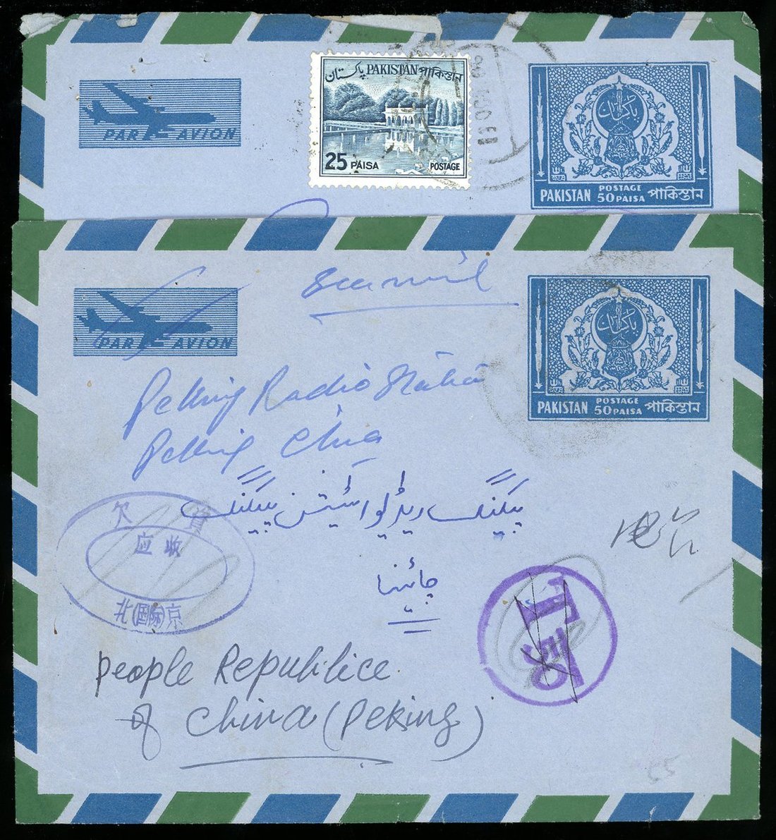 1966-68 two incoming postal air aerogramme with Postage Due seal, from Pakistan to Peking and Shanghai. On the both reverse with Peking or Shanghai arrival c.d.s.