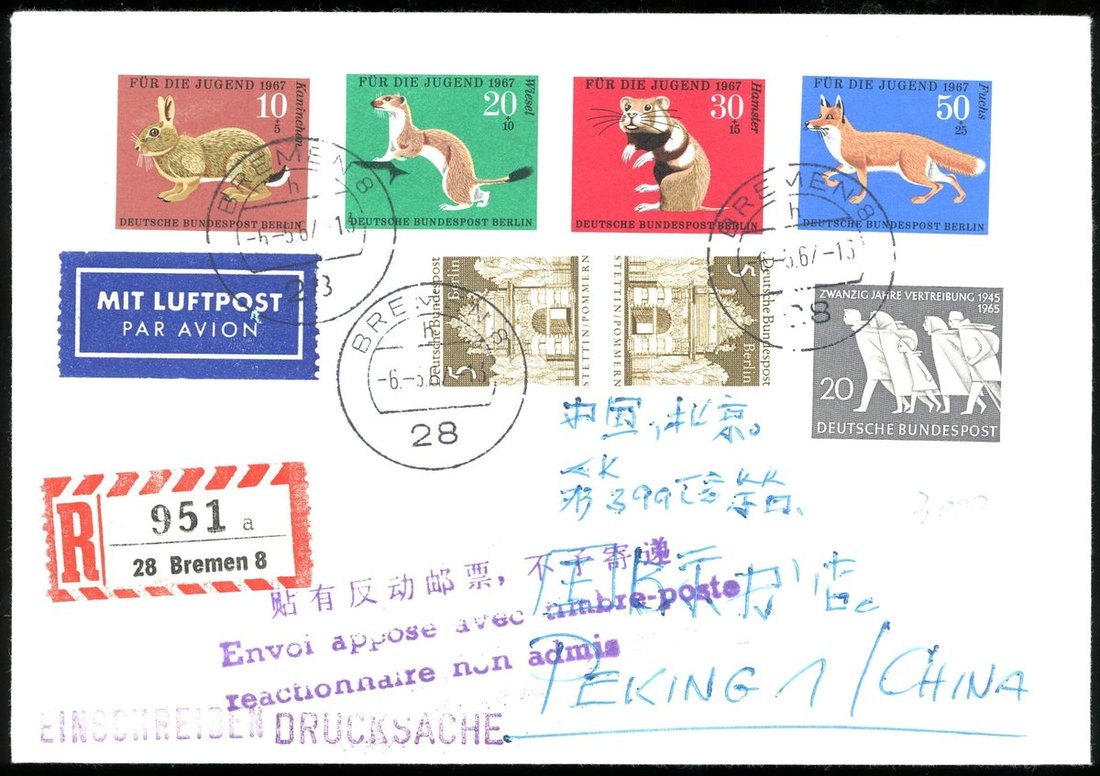 1967年德國不萊梅寄北京航掛封1件,貼“德國人被迫遷移20周年”等郵票7枚,銷不萊梅5月6日戳,因德國人被迫遷移20周年郵票涉及政治原因,而被社會主義國家所抵制,貼此票寄中國之郵件均被視為反動郵票不予寄遞,並退回原寄信人,因此此封在北京國際局蓋“貼有反動郵票,不予寄遞”紫色雙語副戳,退回寄件人,保存完好,難得文革郵政史郵集素材,少見