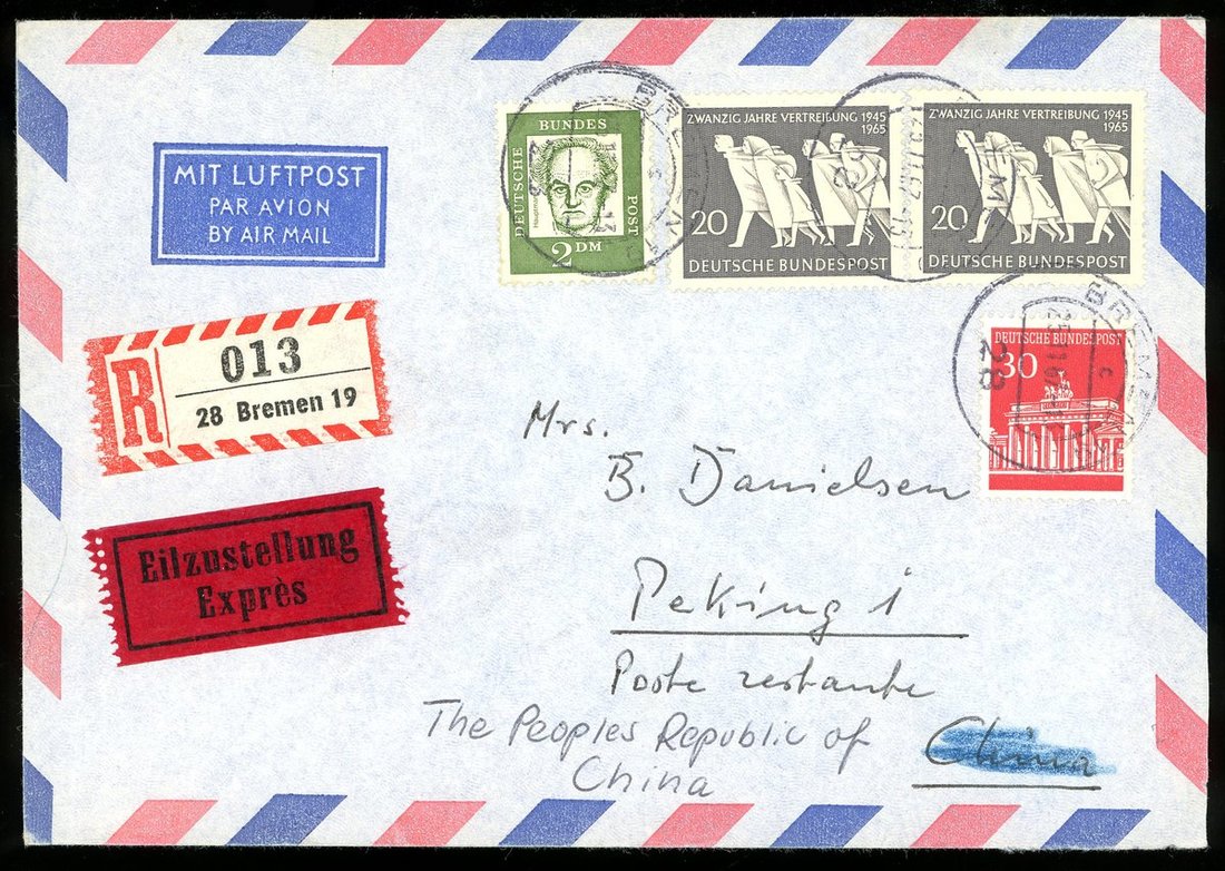 1967 (25 Nov.) Bremen, Germany to Peking air registered cover, but this cover bearing stamp which about "Germans forced to migrate for the 20th anniversary" 1945-1965, so China resisted this cover and returned to Germany. but this cover is rare, because did not with "Do not post" bilingual stamp on cover.