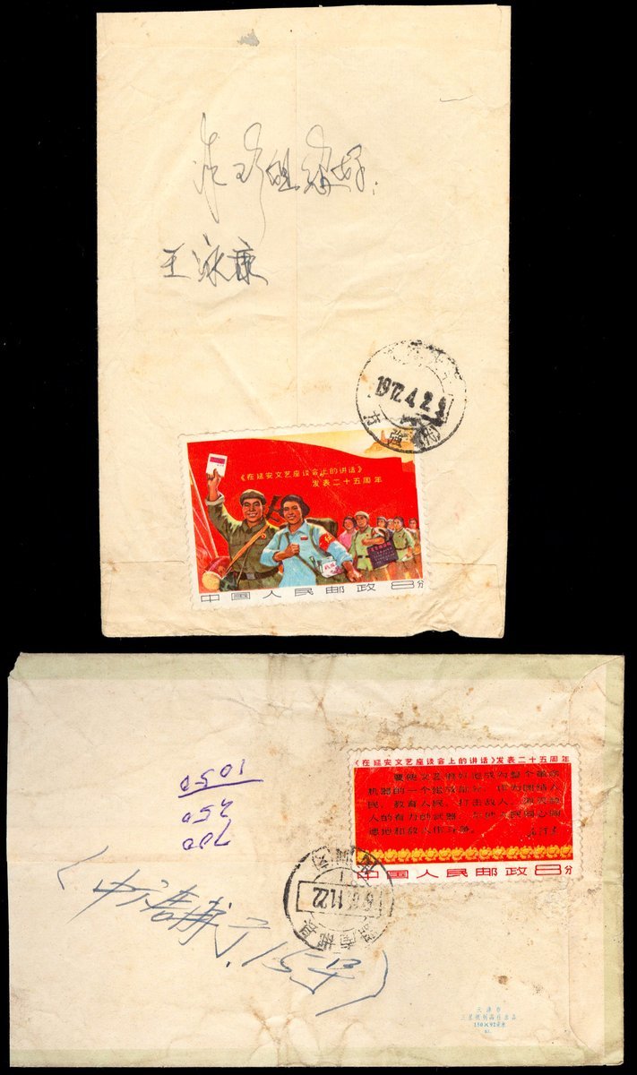1967-72年貼文3郵票實寄封2件,包括67年11月22日貼文3四行半1枚,銷湖南郴縣戳寄長沙封1件;72年4月2日貼文3大旗1枚,銷江蘇大豐方強代辦所戳寄江蘇金湖1件,整體保存完好