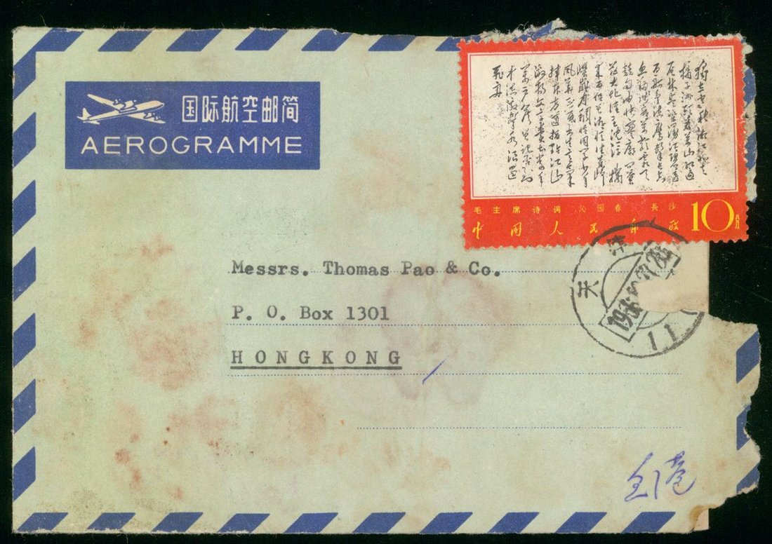 1968 (Dec.) an aerogramme from Tianjin to Hong Kong, bearing W7-6 10f. tied Tianjin c.d.s. broken and stained.