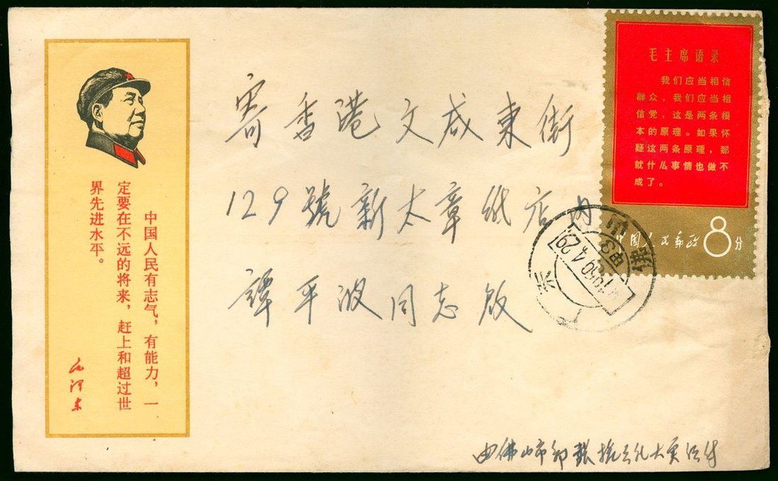 1969 (29 Apr.) Mao's quotation envelope to Hong Kong bearing W1 8f. tied by Fatshan c.d.s., very fine.