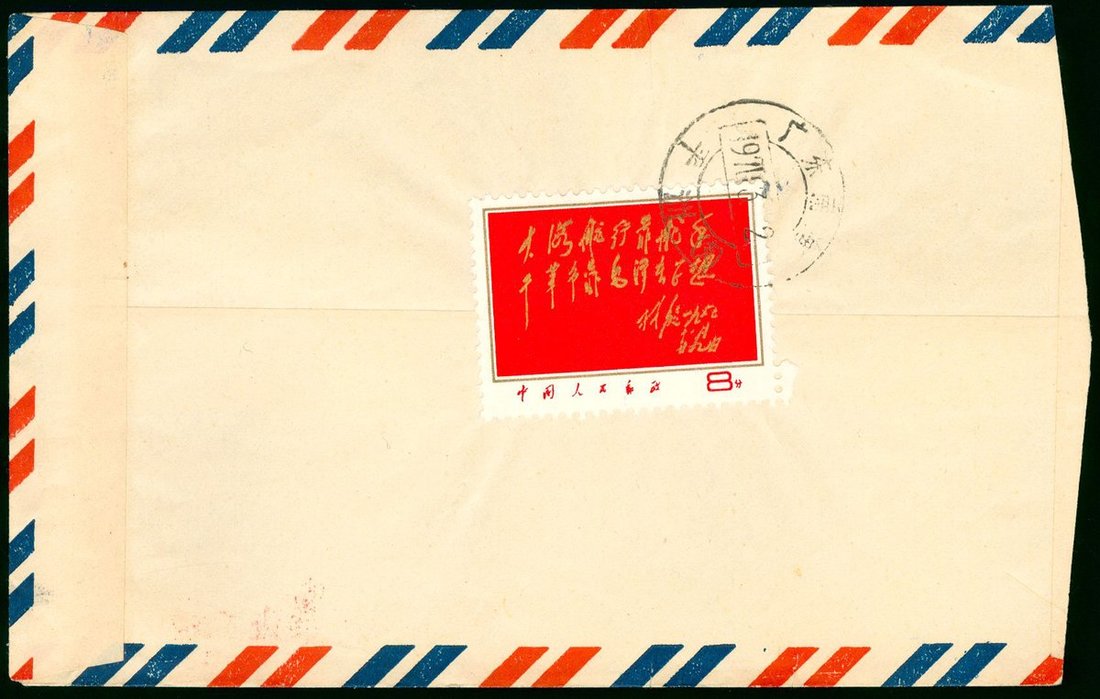 1969-70年貼文8林彪題詞實寄封8件,均單貼文8票,分別銷北京,上海,四川樂山,重慶,廣東南海等地郵戳,其中2件實寄香港,其餘均國內實寄,整體保存完好,請預覽