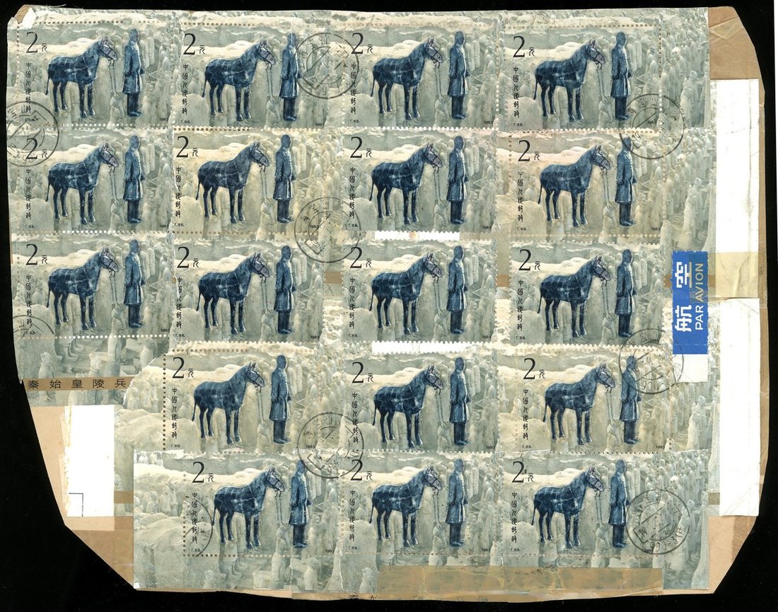 1983年大型剪片1件,貼T88M秦始皇兵馬俑小型張及小本票中小型張內頁18枚,銷上海寶山7月18日戳,保存完好,此剪片為目前所知存世貼最多T88M小型張之郵件,非常少見