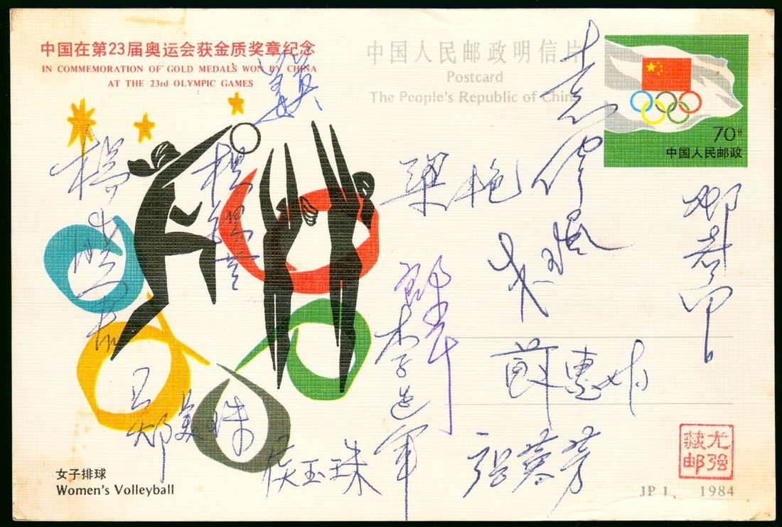 1984 China 70 cent postage card (JP 1) for The 23rd Olympic Games with the signatures of the gold medalists (including Lang Ping, Zhang Rongfang, Liang Yan, etc.) and coaches of the volleyball team. Also attached are the details of each person and the time of competitions and activities in Los Angeles. Rare