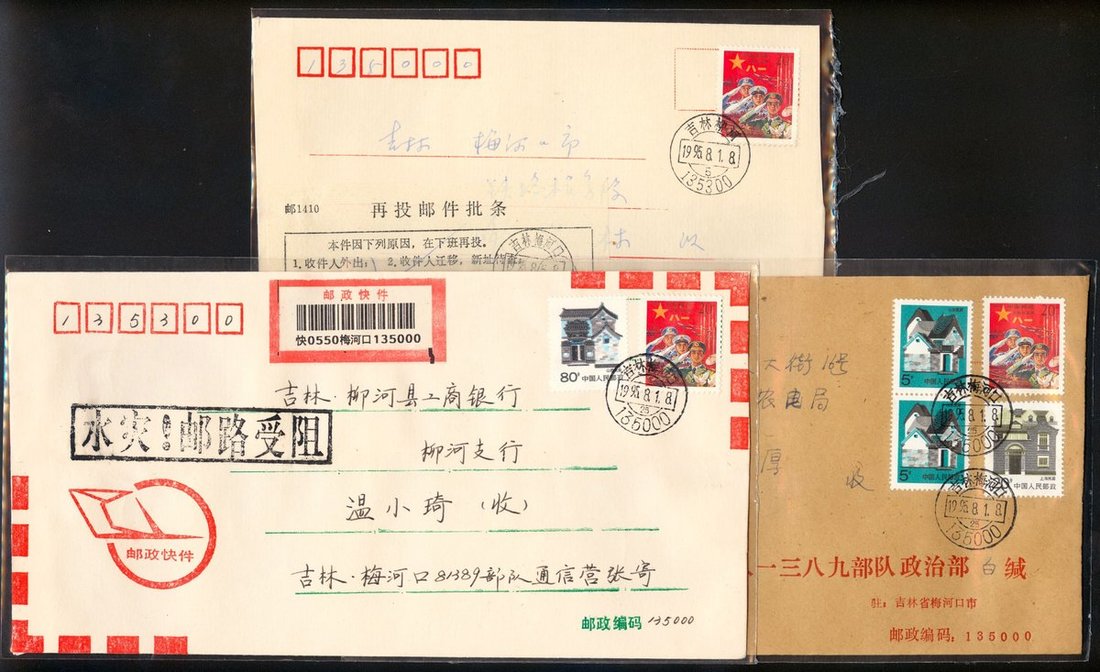 1995年貼紅軍郵首日實寄封一組17件,包括3件平信改退封,2件掛號封,其餘均為快件封,快件封蓋水災郵路受阻副戳,均銷吉林梅河8月1日戳,整體保存完好
