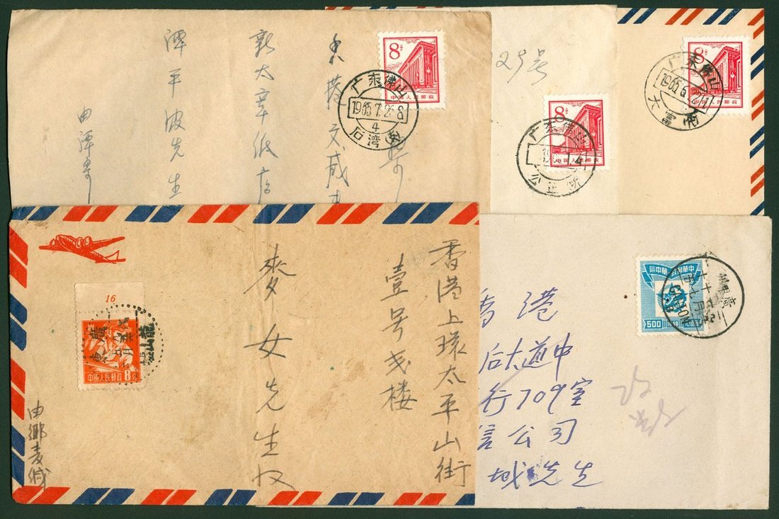1949-66年廣東寄香港實寄封5件,分別貼中南區五星圖,普8,普13等票,銷廣州,龍山墟,佛山石灣支,佛山公正所,佛山大富代等各戳式郵戳,整體郵戳清晰,保存完好