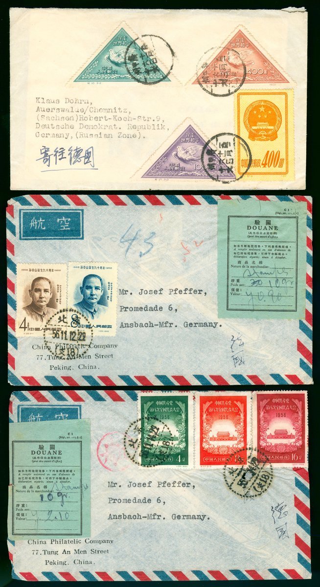 1951-56年北京及廣州寄德國實寄封3件,分別貼紀10,紀37,紀38,特1,特15及普8等郵票,銷北京,廣州郵戳,其中2件貼驗關條,保存完好