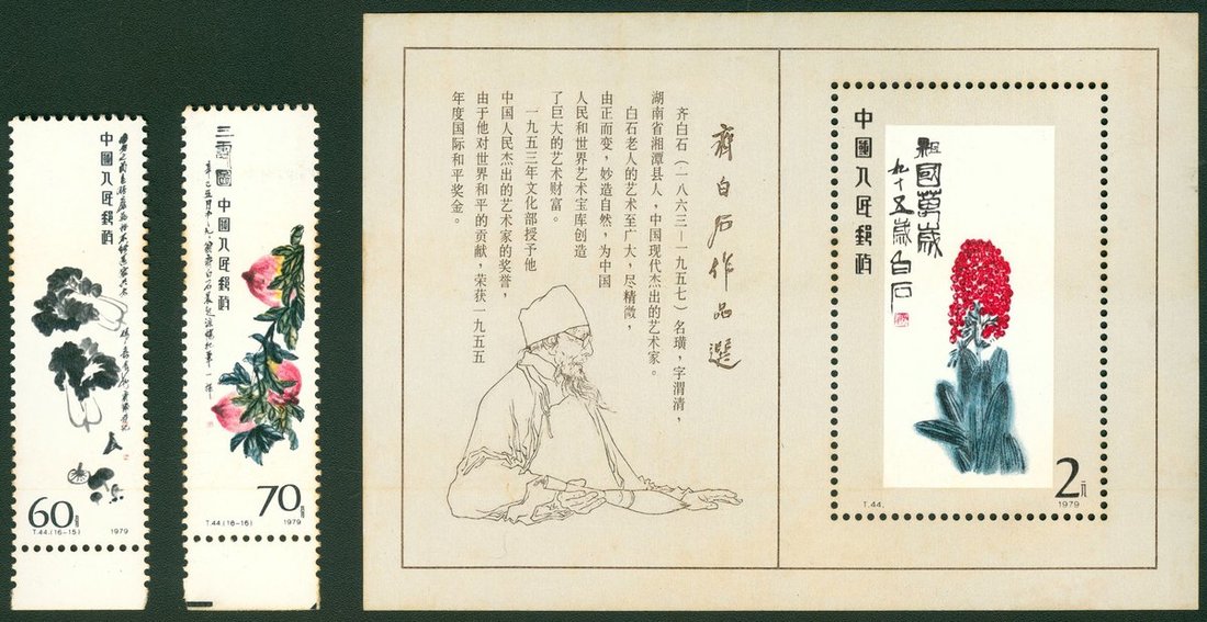 1980年T44 齊白石作品選; 全套十六枚, 另加小型張一枚, 新票未貼, 票背嚴重發黄.