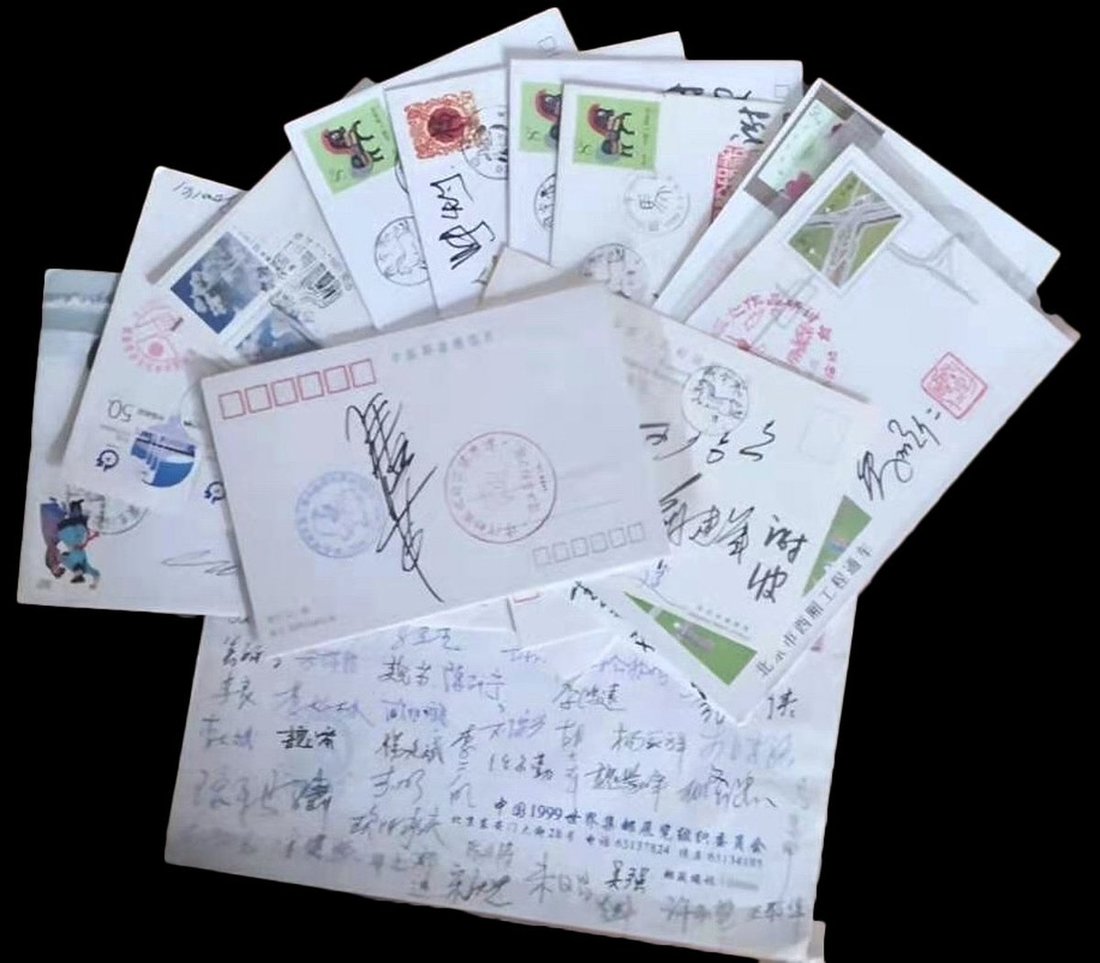 1990-2000年各種郵票首日封,極限片及郵資封等13件,每件均有其郵票設計者親筆簽名,部分為設計者親自實寄,包括劉碩仁,盧天驕,鄒建軍,李慶發,楊文清,張二苗,孟祥斌等人,其中兩枚還有孫少穎等人簽名;另有一件1999年北京寄天津掛號封,利用99北京世界郵展公函封所寄,蓋全國第二屆民間附加費集郵展覽暨學術談論會紀念戳,信封正面有全體與會者簽名,整體保存完好,十分難得