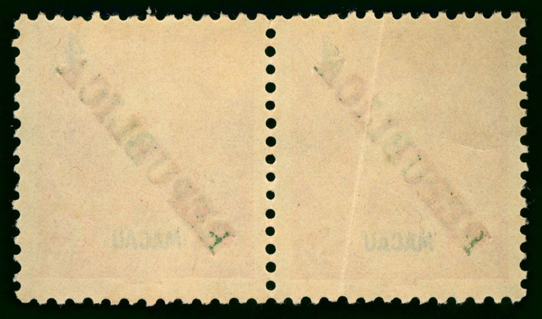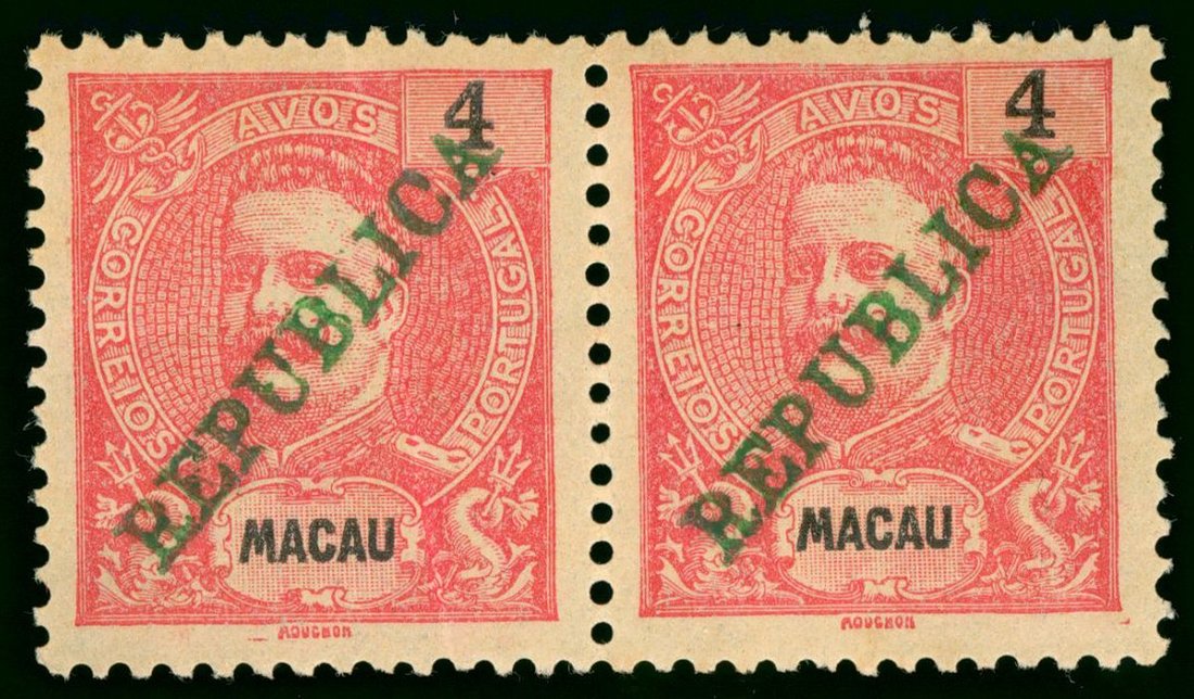 1913 Carlos I overprinted "REPUBLICA" 4a. pair, unused, left stamp lightly folded.