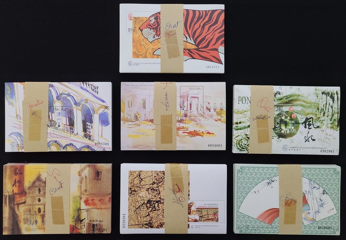 1996 S81M Macau Seen by Herculano Estominho 10p.; C69M 20th Anniv. of Legislative Assembly 8p.; 1997 S91M Macau seen by Kwok Se 8p. ; S96M Balconies 8p. ; S97M Traditional Chinese Fans 9p.; S98M Feng Soi 10p. (100); 1998 S100M Year of Tiger 10p., each type in a packet of 100pcs.