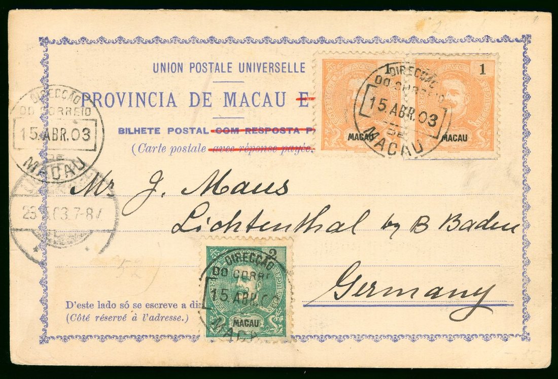 1903 (15 Apr.) formular reply card (with "E Timor" and "Com Resposta" and "avec response payee" ruled out), to Germany 4r. cancelled by "Direccao/do Correio/de/Macau" c.d.s., fine. Yang P31