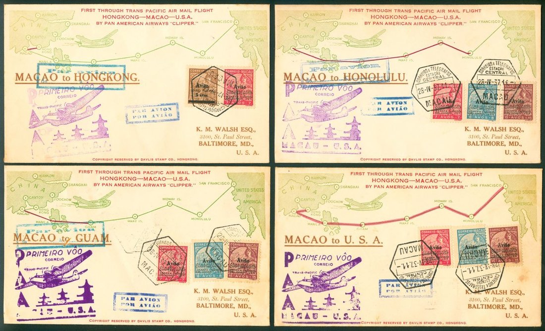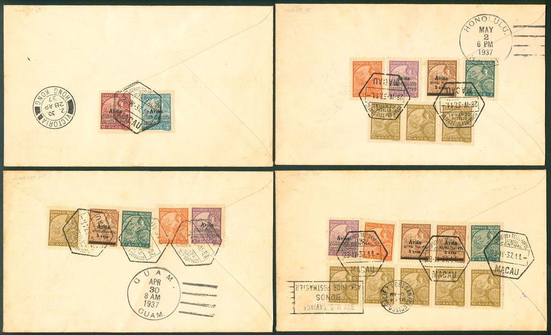 1937 (28 Apr.) First Through Trans Pacific Air Mail Flight Macau to Hong Kong, Guam, Honolulu and U.S.A. bearing overprinted Air Mail stamps, very fine.(4)