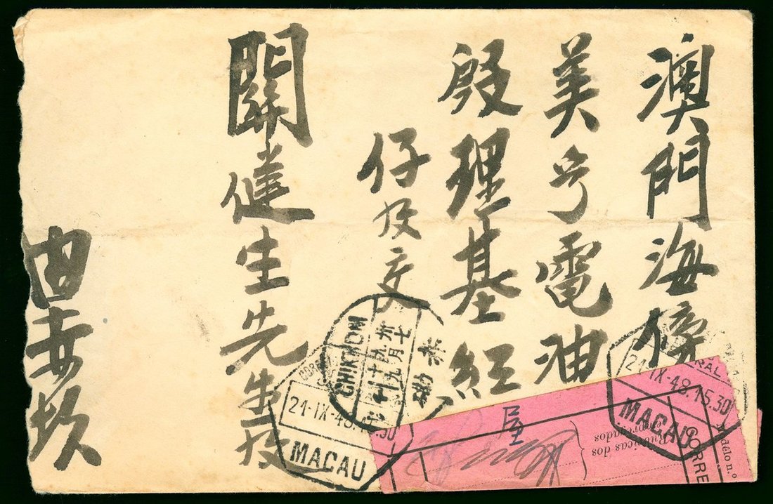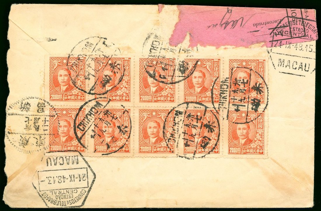 1948 (19 Sep.) envelope to Macau bearing SYS $2000 block of ten tied Chikhom c.d.s., via Sunchong (20.9), showing Macau seal red label tied by Macau (21.9) c.d.s., scarce.