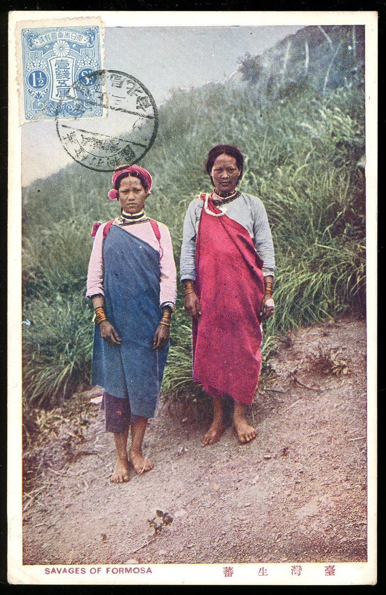 1910年臺灣南國島寄青森明信片1件,貼日本郵票1.5錢1枚,銷基隆打狗間鐵道郵便臺灣局經傳日戳,明信片背圖為臺灣土著居民,保存完好,銷早期臺灣火車郵戳郵件少見