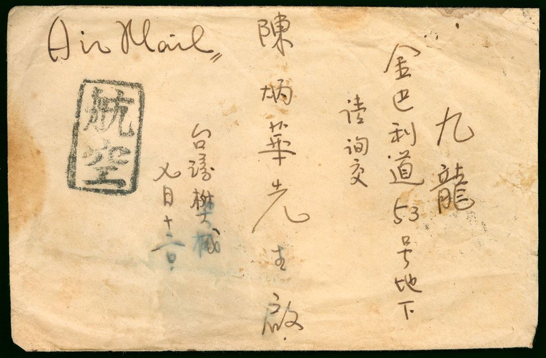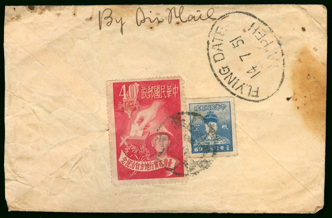 1951 (14 July) Taiwan to Hong Kong cover, on the reverse with Taiwan 40c. and air stamp 60c., tied by Taiwan c.d.s., a oval air c.d.s. alongside.