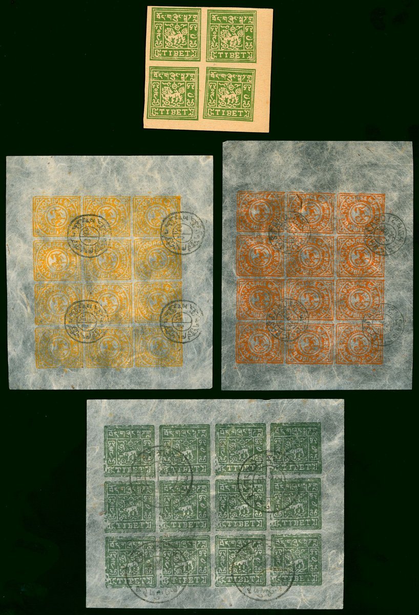 1912-33年西藏獅子圖郵票早期參考品一組,包括不同版不同面值全張8件,四方連1件,整體保存完好,均為早期國外郵商製作,對研究西藏獅子圖郵票辨偽有極大資料價值